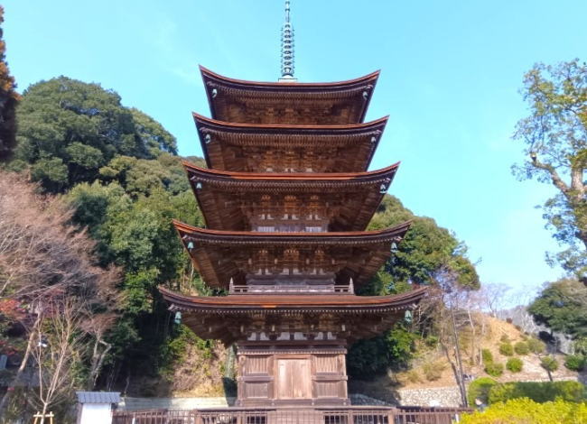 山門をくぐると本堂に向かって右手にあるのは、五重塔創建550年を記念し建立され、実物の塔の約7分の1の高さの石東五重塔。奥には天文元年(1532年)に造られた鐘楼がありますが、普段は釣られ鐘を撞くことはできないそうです