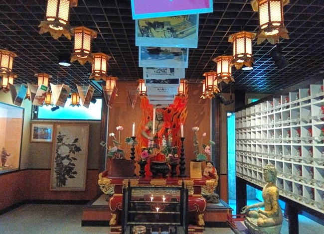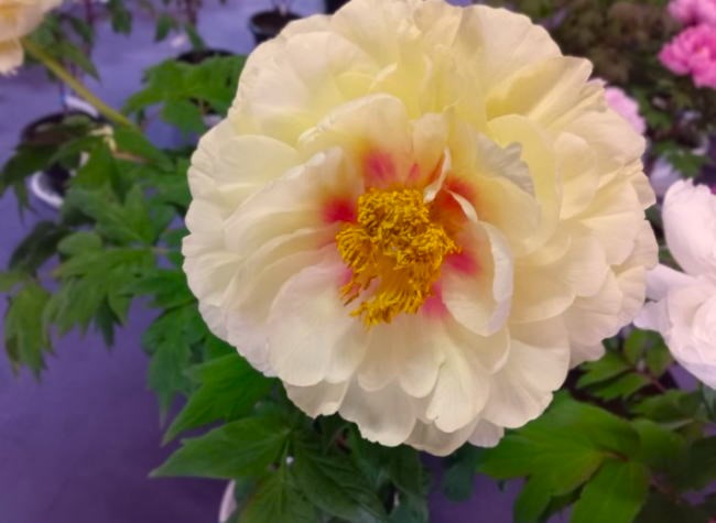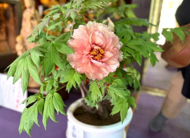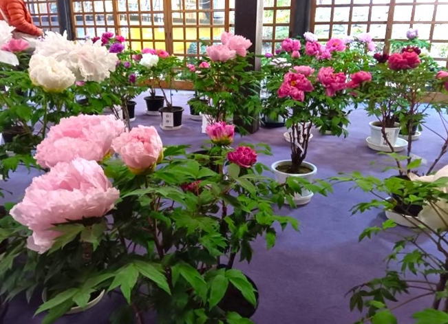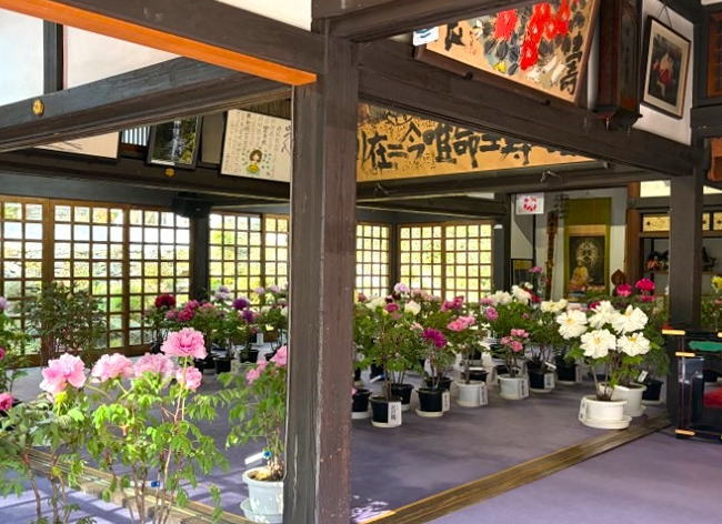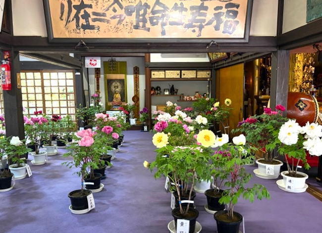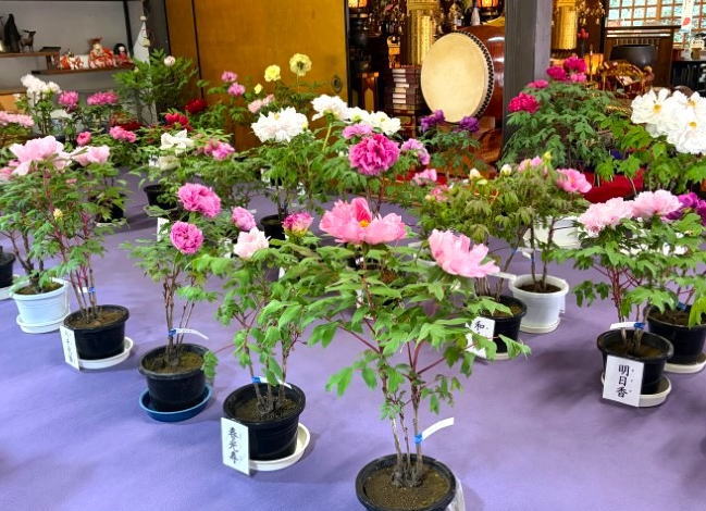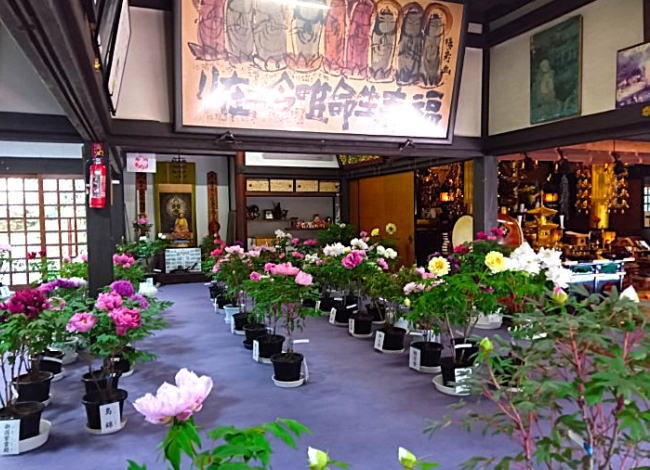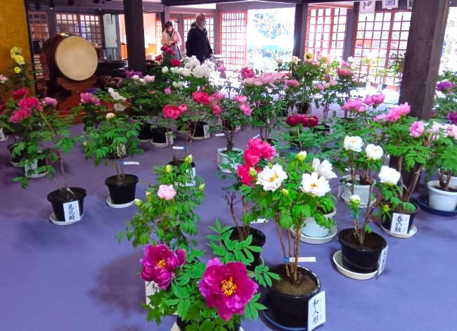 多種多様な品種の鉢植え牡丹は色や咲き方に違いがあり、お堂の中は華やかな雰囲気が漂っています