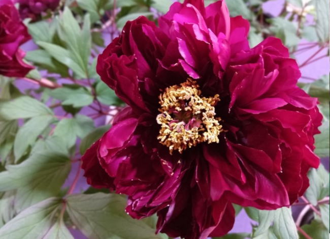 本堂の祭壇横に置かれていた牡丹は「赤銅の輝(しゃくどうのかがやき)」。花色から十円コインの赤銅色を連想して命名されたそうで、新品種で希少だそうです。気品のある美しい色に魅せられました