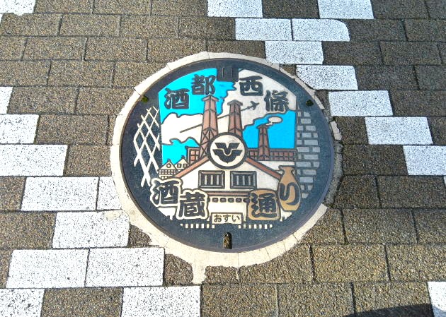 青空と白壁やなまこ壁、レトロな赤レンガの煙突は酒蔵通りにぴったりなデザインのマンホール。カラーマンホールのためよく目立ちます (2024年1月8日)
