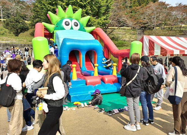 広島東洋カープのマスコットキャラクターのスライリーのふわふわドーム。幼児たちが飛んだり跳ねたり自由に楽しんでます
