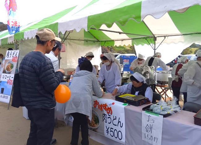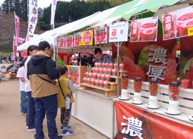 りんご飴やイチゴの濃厚ジュースも美味しそうです。地元のお母さん方が作るうどんコーナーは行列が出来ていました。炊き込みご飯や野菜も販売されています