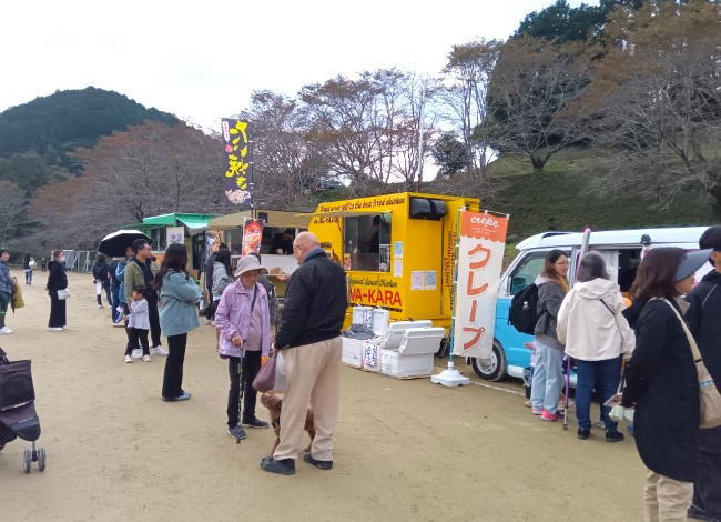 ポテトフライ、クレープ、たい焼きなどのキッチンカーが並ぶコーナー