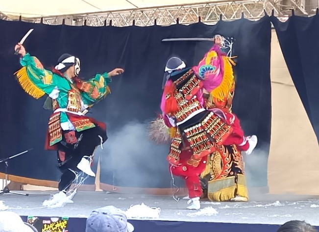 岩国高校坂上分校神楽クラブによる演目「三鬼」。長い時間重い衣装を着けて舞うのは大変でしょうがとても楽しく観戦できました