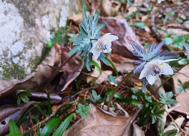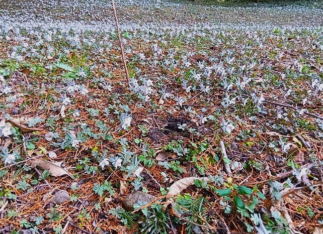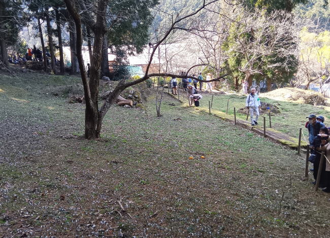 群生地は足場を残してロープが張られています。セツブンソウは関東地方以西に分布し、北向きの半陰地に群生することが多い可憐な山野草です