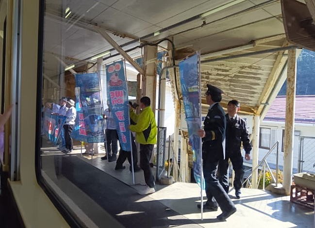古市節分草保存会の皆さんや駅員の方々がホームまで見送りに来てくださいました