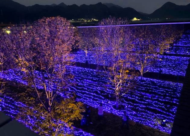 通路や庭、レストランもシャンパンゴールドや青、白色にライトアップされ、幻想的な光に包まれています。12月7日(土)~令和7年2月15日(土)までの毎週土曜日と1月12日もナイトミュージアムが開催されます。期間中は日没に合わせて点灯されています