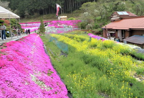 入り口付近には菜の花が咲き芝桜との美しいコラボを見ることができます