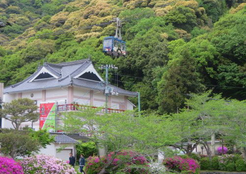 岩国城へのロープウエイが山麓駅から発車しました。標高約200メートルの城山の尾根の山頂駅までを約3分。城下町の全貌を見渡せます