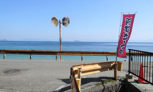 道の駅「サザンセト東和」近くには、本島から約100m沖に浮かぶ小さな無人島・ 真宮島 があります、干潮時の前後3時間だけ砂の道が現れて渡ることができ恋のパワースポットとして知られています。堤防を歩き砂浜を目指します