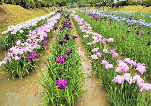 掘割に咲く吉香花菖蒲園には90種類10万本。岩国城下吉香神社裏の城山花菖蒲園には50種類1万本が植えられています。ゆっくりと観賞できるように一周遊歩道が設けられています