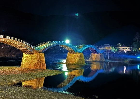 錦帯橋はウクライナの平和を祈り、ウクライナの国旗をイメージ青と黄色にライトアップされています。多くの人が犠牲になる戦争が1日も早く終わり、世界が平和の輪で繋がりますよう祈るばかりです (2022年3月14日撮影)