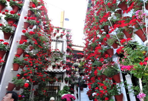 アンダルシア地方は美しい中庭のある家々が数多くあることで有名です.コルドバは、パティオ(中庭)が美しいところといわれています。人一人がようやく通れるような狭い道の両側の白壁の街並みに花の小鉢が飾られています。毎年5月は、街がカラフルで華やぐ時期です