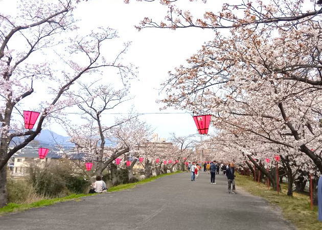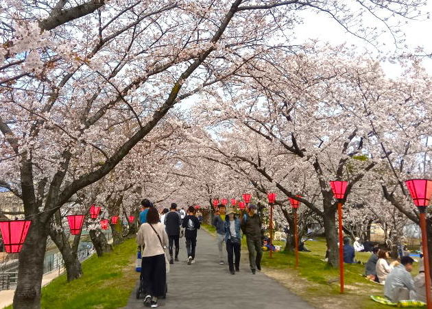 桜の時期には県内外から多くの人が桜を見に訪れる観光スポットの一つになっています。ほぼ満開の桜の下ではお弁当を広げているグループを沢山見かけました。陽気に誘われて凄い人出です