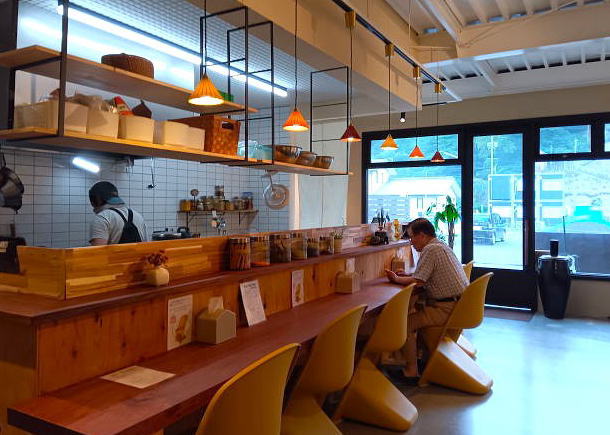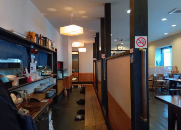 店内は座り心地のよさそうなカウンター席、テーブル席があり、清潔な厨房も見渡せます。錦帯橋店は、1号店の岩国駅前店店に続いて2店舗めで、金、土曜日のみオープンしています