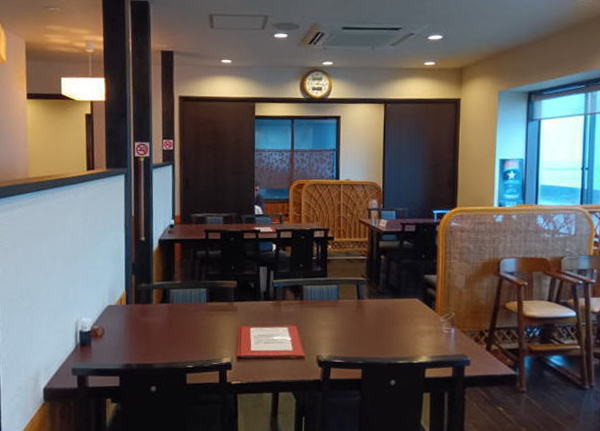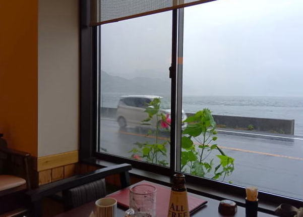 店内は、手前側がテーブル席で奥はお座敷になっています。あいにくの雨模様で海がかすんで見えます。大畠瀬戸の海は、豊かな漁場が広がる全国数数の釣りのメッカとして知られており多くの釣り人が船釣りを楽しんでいます