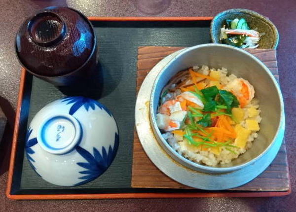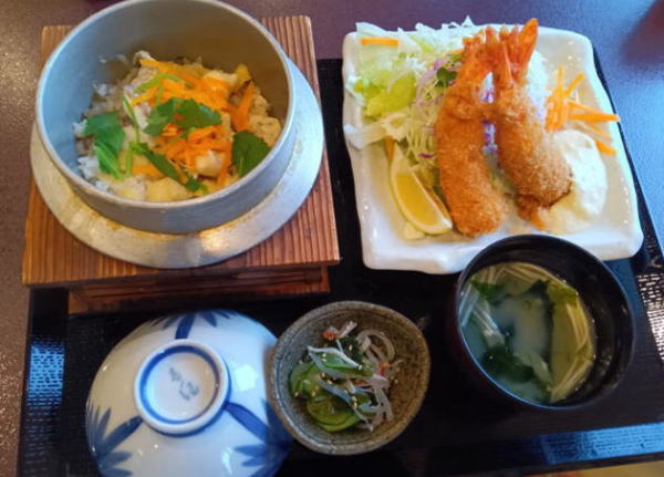 えびかま飯(¥1,400) 釜めしは、海鮮、えび、タコ、タイの4種類から選べます。新鮮でプリっとした歯ごたえのある大きめのえびが入った釜めしは、薄味で程よいおこげでとても美味しい。みそ汁、酢物、お漬物がセットされています