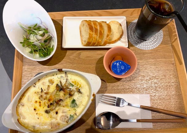 エビときのこのぐるぐるセット(¥1,540) らせん状の特製パスタにエビときのこを混ぜたっぷりのチーズをのせ焼き上げたグラタンは、味付けも控えめなホワイトソースにモッツァレラチーズの香ばしい香りがしとても美味しい。
