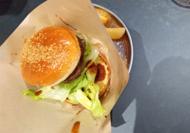バーガーポテトフライコンボ(¥1,250) バンズも柔らかく、ジューシーなパティ。肉本来の旨味を引き立てるためソースは控えめなのですが、パティが肉厚ななので食べ応えあります。地元では年齢層を問わず広く支持される人気店だそうです