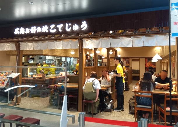 広島駅ビル「ミナモア」は6Fのフードコートのなかの「カンパイ横丁」にあり、昭和っぽい雰囲気の店内は、オール鉄板のテーブル席を完備しています。行列ができる人気店なので混雑時を避け、少し早い時間に訪問