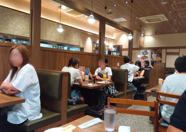 広いフロアで座席数も多く、グループなど大人数でも安心して利用できそうです。席に座ったままスマホで注文から決済までできるシステムになっています。水、お手拭きなどはセルフですが、食器の返却不要です