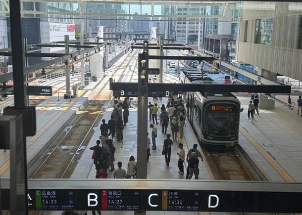 5月に来たときはまだ工事中でしたが路面電車が広島駅ビル「ミナモア」への乗り入れを開始していました。路面電車が広島の町を走り始めて111年。 広島駅への利用者が増え、街の形が大きく変わってきています (2025年8月20日)