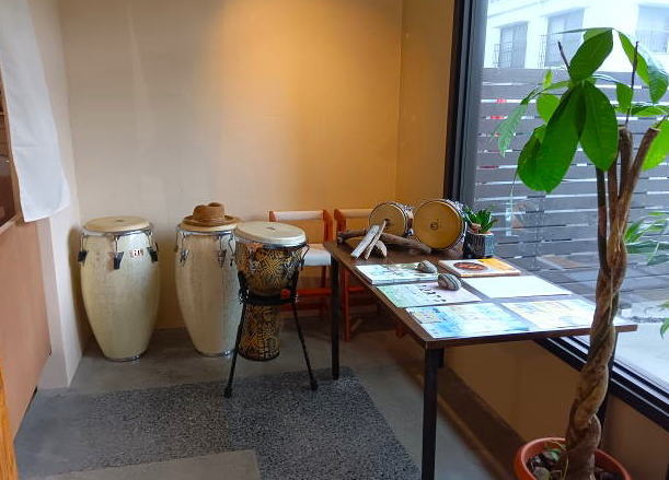 アフリカやキューバの楽器ジャンベやコンガがインテリアとして飾られています?ドラム奏者でもあるオーナーが演奏されることもあるそうです