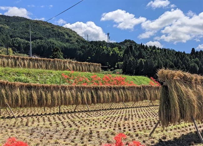 棚田のあちらこちらでは稲刈り風景が見られます。刈り取った稲は「はぜかけ」天日干しにゆっくりと乾燥させます。手間暇をかけ美味しいはぜかけ棚田米「米っ棚(まいったな)」に育てていきます