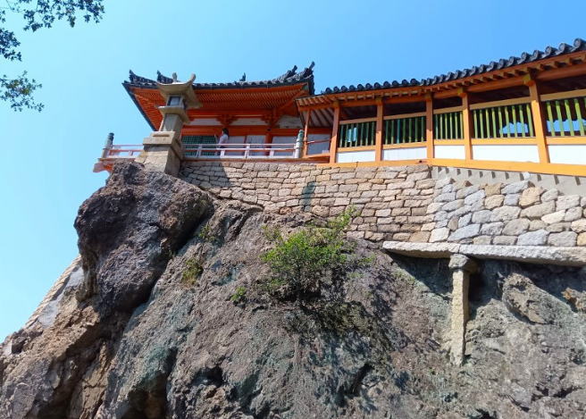 沼隈半島の南端、瀬戸内海を一望できる阿伏兎岬の断崖絶壁に建つ朱塗りの観音堂: 阿伏兎観音堂 は鞆の港より少し南の方にあります。1570年に毛利輝元によって建てられたと伝えられており国の重要文化財 に指定されています(拝観料:300円)