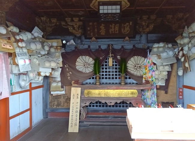 瀬戸内を行き交う船の航海の安全のほか子授け、安産の祈願所として知られています。堂内には安産祈願の「おっぱい絵馬」が奉納されています。床は幅が海に向かって斜めになっており、おまけに欄干も低いので足元に注意が必要です