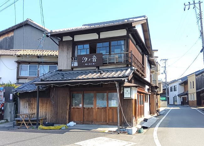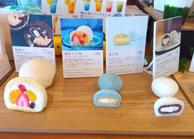 常夜灯が見え店の前には海が広がるロケーション抜群の大福専門店・汐の音。潮待ち大福、鞆の雫、鞆の浦大福、など・・・黒豆がごろと入り、優しい塩味の黒豆大福が一番人だそうです。大福のほかに鞆の浦をイメージしたソフトクリームやソーダフロートなどのドリンクもあります