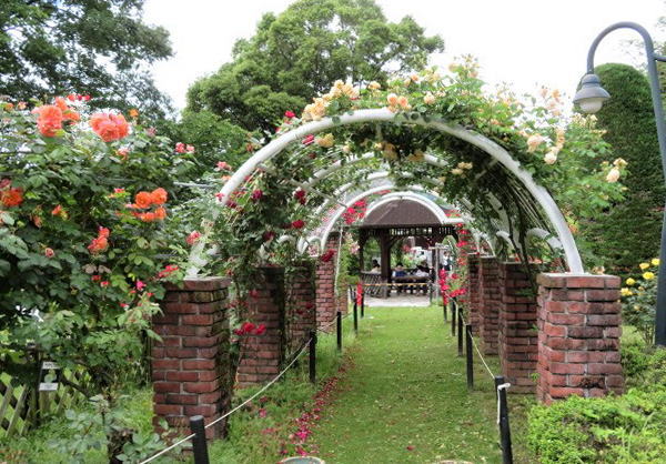 アーチ状になった入り口が見えてきました。バラ園以外にも牛田公園には、テニスコートや遊戯広場、モントリオールミニチュアガーデン、多目的広場などの施設があります