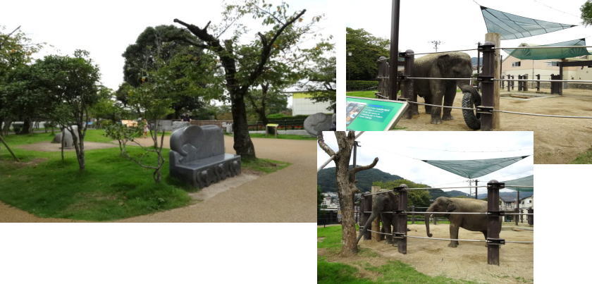 ぞうさんの夢広場 ぞうさんのイスは有名な童謡「ぞうさん」を作詞された徳山市出身の童謡詩人まど・みちよさんの100才を祝って寄贈されたものです。スリランカゾウの ナマリー(左)と ミリンダ(右)。この日は雌のナマリ‐の誕生日で好物のスイカなどがプレゼントされたそうです