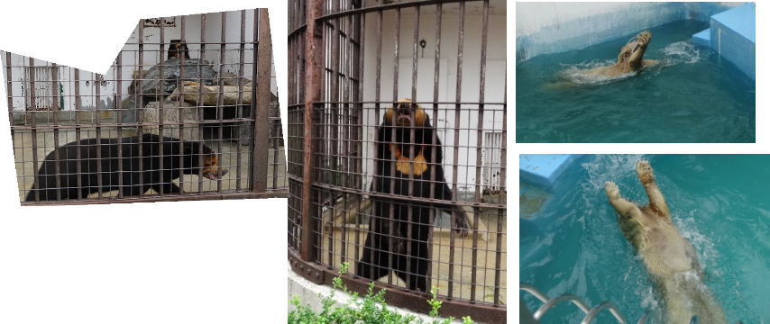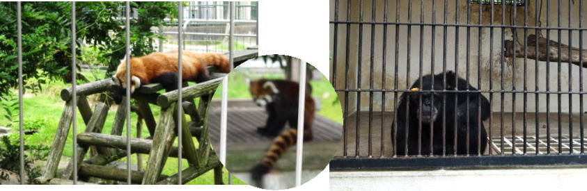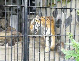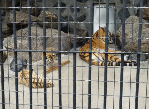 アムールトラ 6月11日に赤ちゃん3頭が誕生!雄1頭と雌2頭で、名前が決まったそうです。周・南・市から一文字ずつもらって 「シュウ」 「ミナミ」 「イチ」 という名前がついたそうです。とても可愛く、元気に動きまわっていました。右はお父さん虎。奥さんや子供たちから隔離されていて、イライラと落着かないようで檻の中をぐるぐる回ってばかりいました。トラの檻の前は多くの人だかりができていました