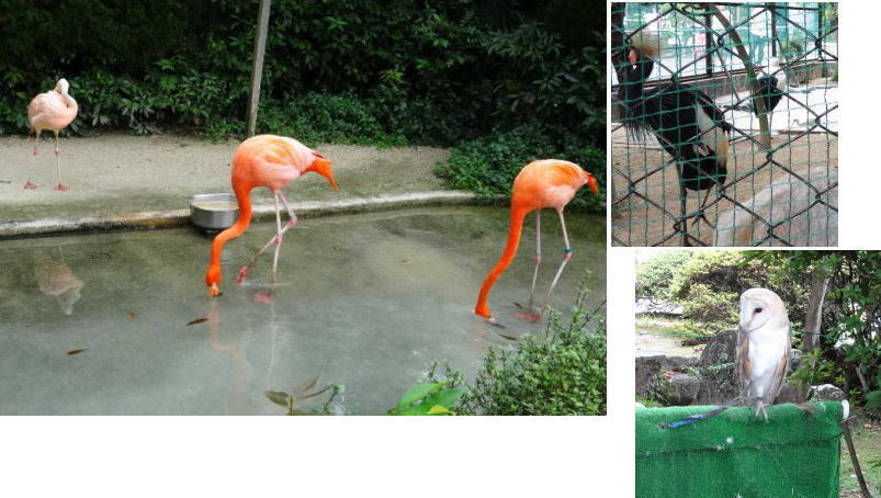 最後はフラミンゴ 色の鮮やかなのが紅色フラミンゴで、もう一方がチリ‐フラミンゴです。優雅に餌を探している姿は、美しいです。頭にかんむりを付けているカンムリツルは、想像よりはるかに大きく迫力満点です。置物と間違えたくらい動かないオームさんが見送ってくれます